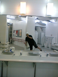 疲れて来たので、ここでキツいジーンズからジャージに着替えてみました。 頭にはタオル。 時間的にも人の途絶える頃。どんな格好だって良いんだもんね〜・・・と、既に女であることも捨てたような格好になります。でも、運転は楽な状態でするのが一番ッッ!! 画面左端には洗顔道具一式。顔を洗って歯も磨く。休憩時間を満喫している所です。最近のSAには、シャワールームやお風呂、更には宿泊施設がある所も。充実しまくりです♪ |