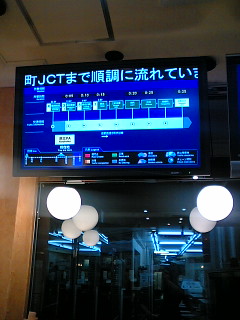 飲食コーナーの情報掲示板。 いつもはかなり混み合う場所も渋滞ゼロ。 店内も、道路も静かでした。 |